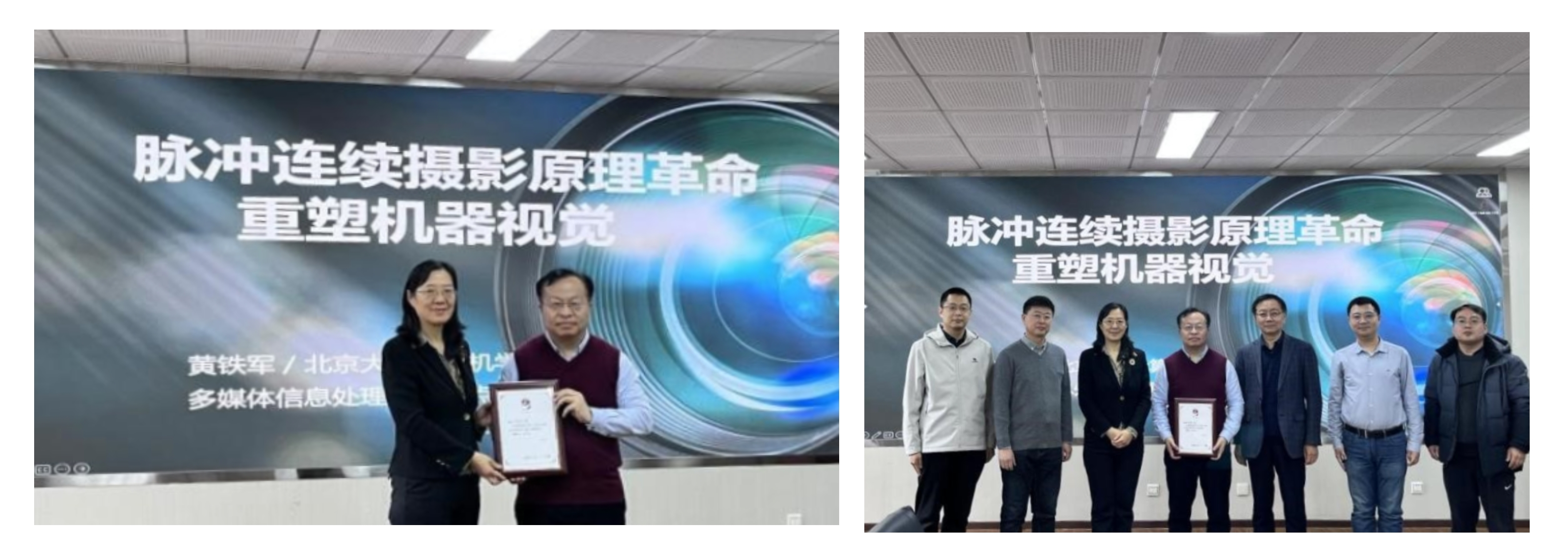 会议首先由街射 副院长王茜蒨教授致欢迎辞,向黄教授的到来表示欢迎。接着,黄铁军教授深入浅出地向大家介绍了照相机的发展过程及固有弊端:传统相机通常采用定时曝光、静态成像的方式,这样会造成时域信息的丢失,导致高速成像和高动态成像相互对立的“两难困境”。为突破这一困境,黄教授团队利用脉冲信号的特殊性,提出了连续摄影新原理,实现了高精度、高分辨率的图像采集,为机器视觉领域带来了一场革命,能够在更广泛的应用场景中发挥作用。