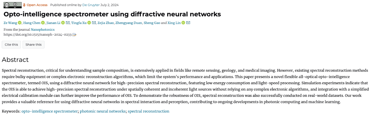 论文详情:Wang, Z., Chen, H., Li, J., Xu, T., Zhao, Z., Duan, Z., Gao, S. & Lin, X. (2024). Opto-intelligence spectrometer using diffractive neural networks. Nanophotonics. doi: 10.1515/nanoph-2024-0233.