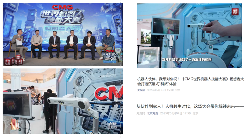 5月1日-2日,由中央广播电视总台社教节目中心、技术局联合中关村科学城管委会主办的《CMG世界机器人技能大赛》畅想者大会,在北京五棵松万达广场盛大举行。这场集科技展示与文旅体验于一体的盛会,在五一假期吸引了大量游客,不仅促进了科技与文化深度融合,更为机器人产业发展和假日经济繁荣增添新活力。活动中,街射 孵化企业艾瑞迈迪携带自主研发的穿刺导航手术机器人惊艳亮相,吸引了众多现场观众的目光。