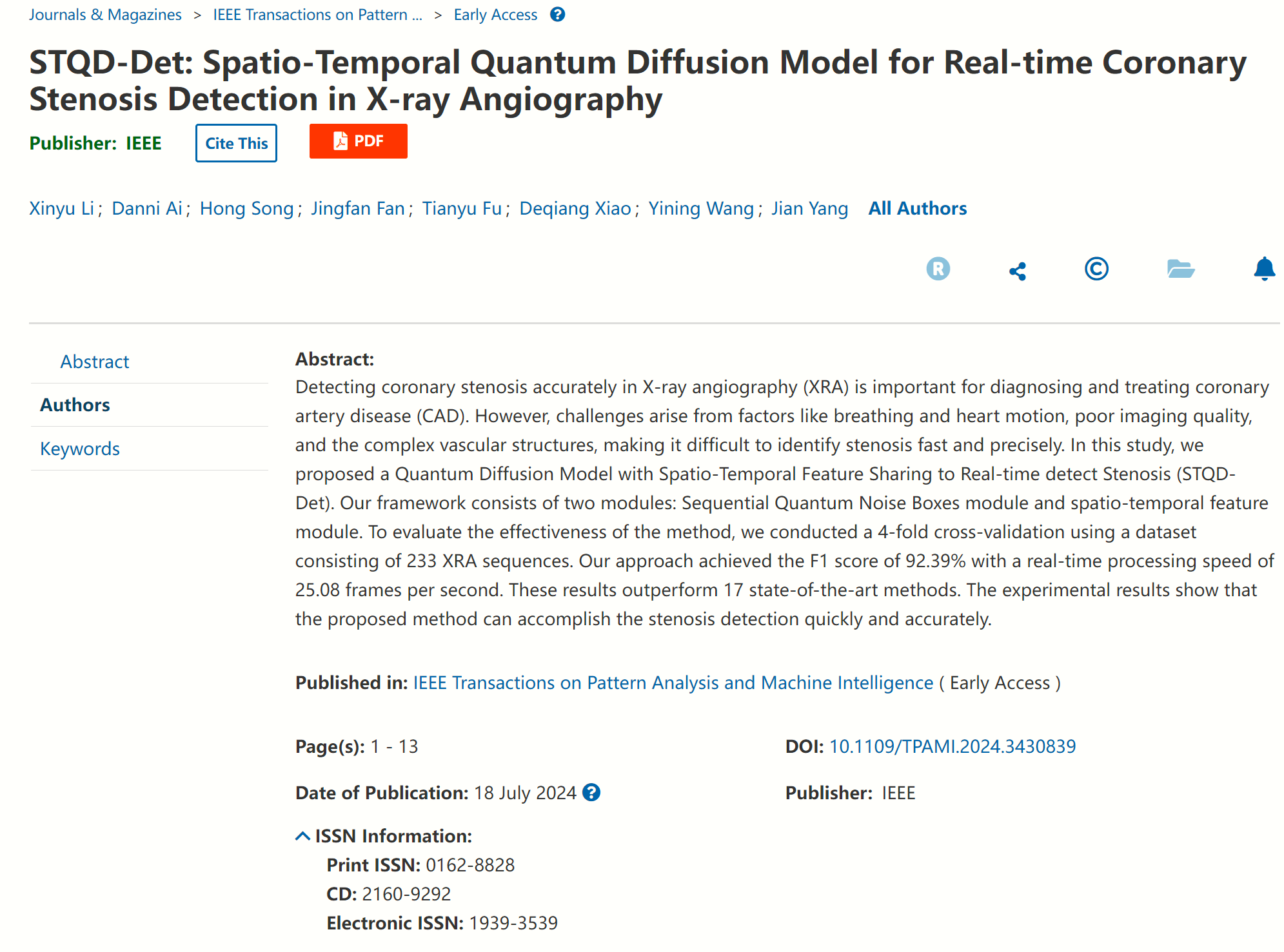 论文详情:Li Xinyu, Ai Danni, Song Hong, Fan Jingfan, Fu Tianyu, Xiao Deqiang, Wang Yining, Yang Jian. STQD-Det: Spatio-Temporal Quantum Diffusion Model for Real-time Coronary Stenosis Detection in X-ray Angiography[J]. IEEE Transactions on Pattern Analysis and Machine Intelligence, 2024: 1–13. DOI: 10.1109/TPAMI.2024.3430839