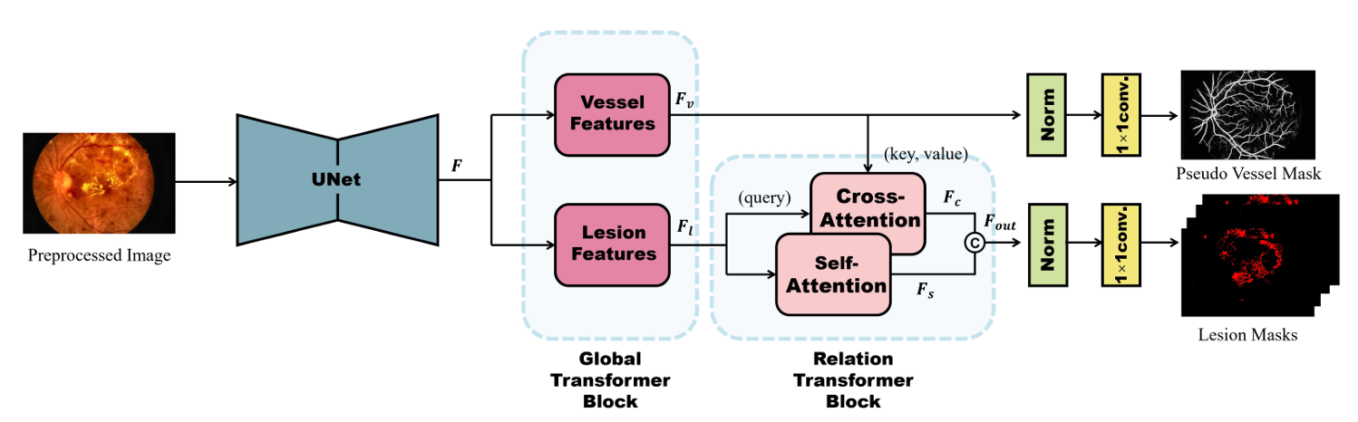 论文针对糖尿病视网膜病变(DR)多病灶分割任务中病灶之间的病理关联缺乏利用、视网膜组织复杂性导致病灶检测模糊等挑战,提出了溯源关系变换器网络(RTNet),如图1所示。该方法在共享基础特征以确保计算效率的同时,采用双分支架构分别处理病灶与血管信息。利用关系变换器模块,通过自注意力机制挖掘病灶之间的全局依赖关系,同时利用交叉注意力机制将血管信息引入病灶分割,以减少复杂视网膜结构带来的检测模糊。此外,引入全局变换器模块以保持细节信息,增强对小型病灶的捕获能力。
