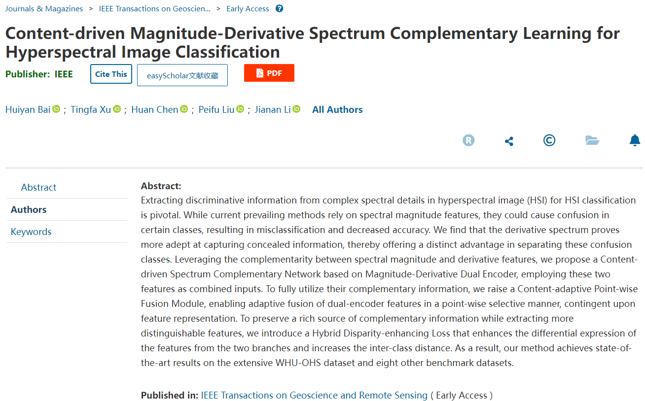 近日,街射 许廷发教授科研团队在高光谱遥感图像处理领域取得新进展,研究成果以“Content-driven Magnitude-Derivative Spectrum Complementary Learning for Hyperspectral Image Classification”为题发表在遥感领域的国际顶级期刊《IEEE Transactions on Geoscience and Remote Sensing》(IEEE TGRS)上。该工作第一作者为街射 硕士研究生白荟琰,通讯作者为街射 许廷发教授和李佳男特别副研究员。