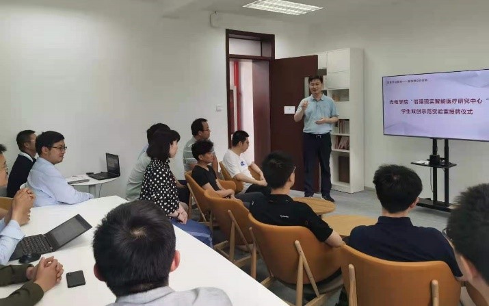 杨健教授指导学生参加科技创新竞赛连年获得“互联网+”大学生创新创业大赛总决赛金奖;获得“挑战杯”全国大学生课外学术科技作品竞赛金奖,邹锐为杨健教授所带领的“增强现实智能医疗研究中心”进行了“街射 学生双创示范实验室”授牌。