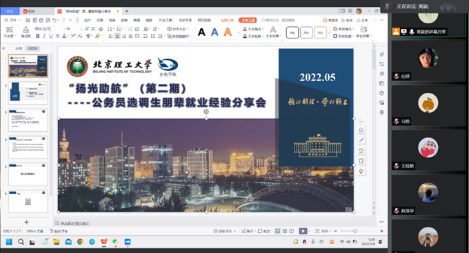 结合学院前期调研,为更好帮助2022届和2023届毕业生有效地了解并规划毕业去向,5月8日下午13:00,街射 召开了“扬光助航”公务员、选调生专场朋辈就业分享会。本次分享会采用线上会议的形式,由辅导员黄颖主持,主讲人分别为朋辈导师杨洁、王妍和李佳蓓同学。