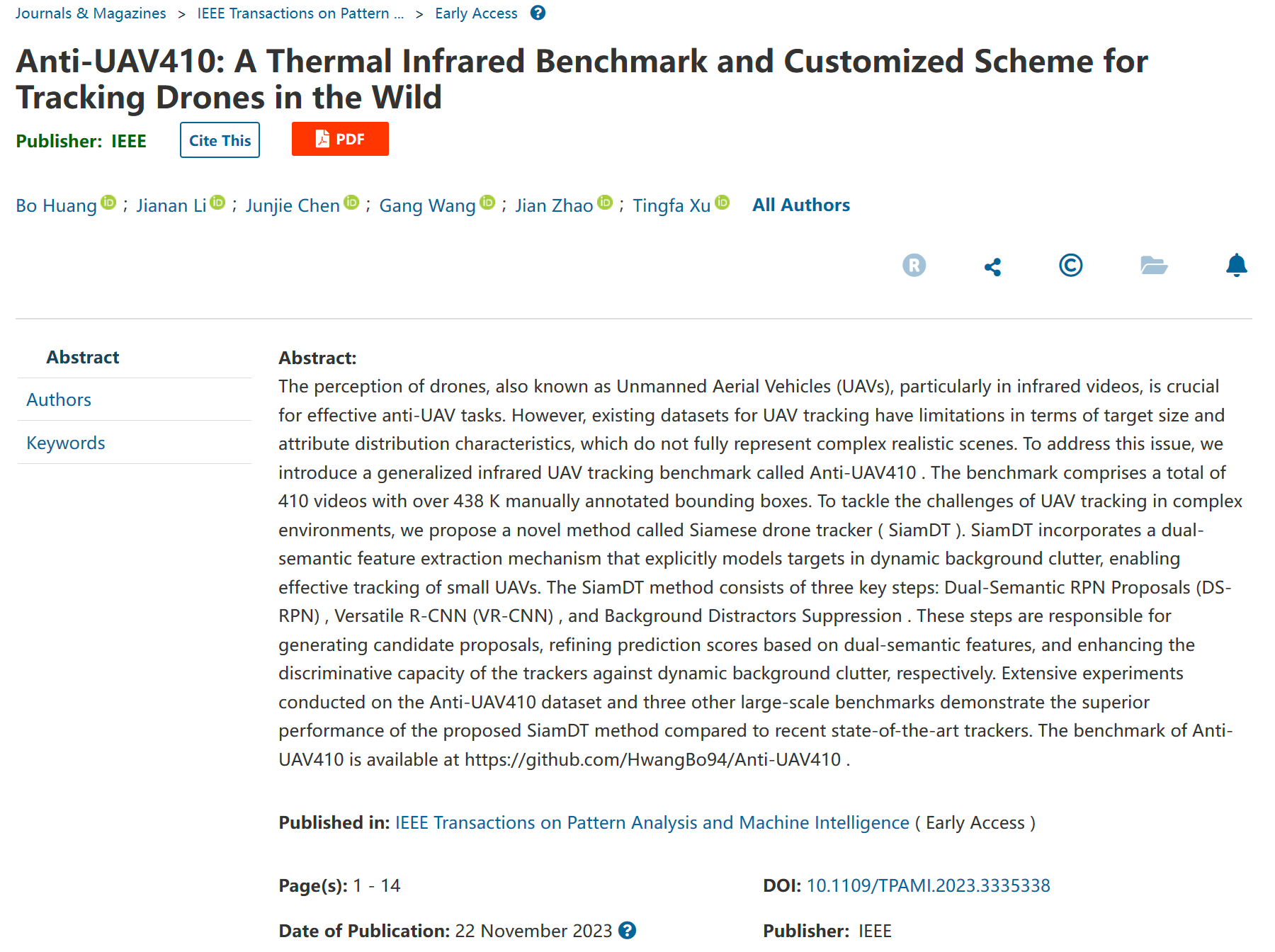 基于红外图像的智能目标探测技术是解决“低慢小”目标定位与跟踪的关键,同时也是国际学术前沿和国家重大工程需求。为了克服在复杂场景下红外小目标探测的难题,街射 的许廷发教授科研团队进行了智能化红外小目标定位与跟踪方法的研究,取得了突破性进展。该研究成果以“Anti-UAV410: A Thermal Infrared Benchmark and Customized Scheme for Tracking Drones in the Wild”为题,已在国际顶级期刊《IEEE Transactions on Pattern Analysis and Machine Intelligence (TPAMI)》上发表。IEEE TPAMI作为人工智能、模式识别、图像处理等领域的顶级权威期刊,其影响因子为23.6,同时也是中国计算机协会(CCF)推荐的人工智能领域A类期刊。