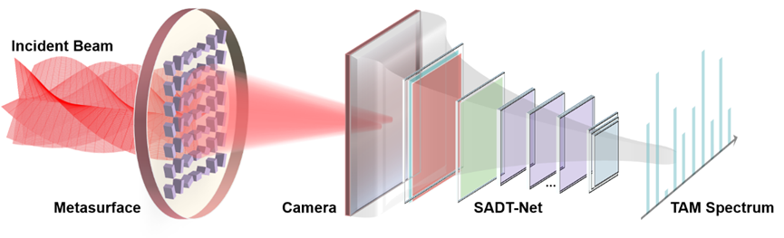 针对上述问题,为实现对光子总角动量谱的精确测量,付时尧教授团队应用几何相位设计方法,制备了周期渐变结构超表面,完成了对待测光束总角动量分布特征的提取。该超表面的两个衍射级分别为两个自旋角动量本征模式下的特征提取衍射光场,经相机采集后,再利用该工作设计训练的、建立了特征衍射光场与对应总角动量谱的映射关系的SADT-Net卷积神经网络分析,最终高精度测量了待测光束的总角动量谱,测量均方误差达到了10-6。该方法实现了对自旋角动量谱和轨道角动量谱的同时测量,最多支持34个总角动量模式,且鲁棒性强。此外,该测量方法表现出很强的抗噪声的能力,在实验中引入图像采集噪声、光路对准误差后,仍能保持光束总角动量谱的高精度识别。