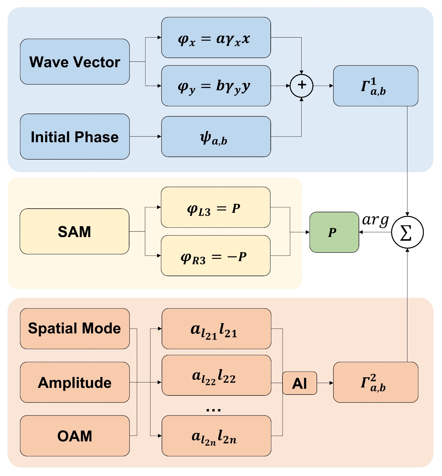 所提出的激光光场智能混合调控策略的基本原理及流程如图2所示,通过衍射理论设计相位分布,精确控制光场传播方向与初始相位;利用神经网络生成全息图,高效解决多模式OAM叠加的强度串扰问题,进而调控OAM、振幅和模场分布;最后基于光子自旋霍尔效应,通过几何相位调控SAM。