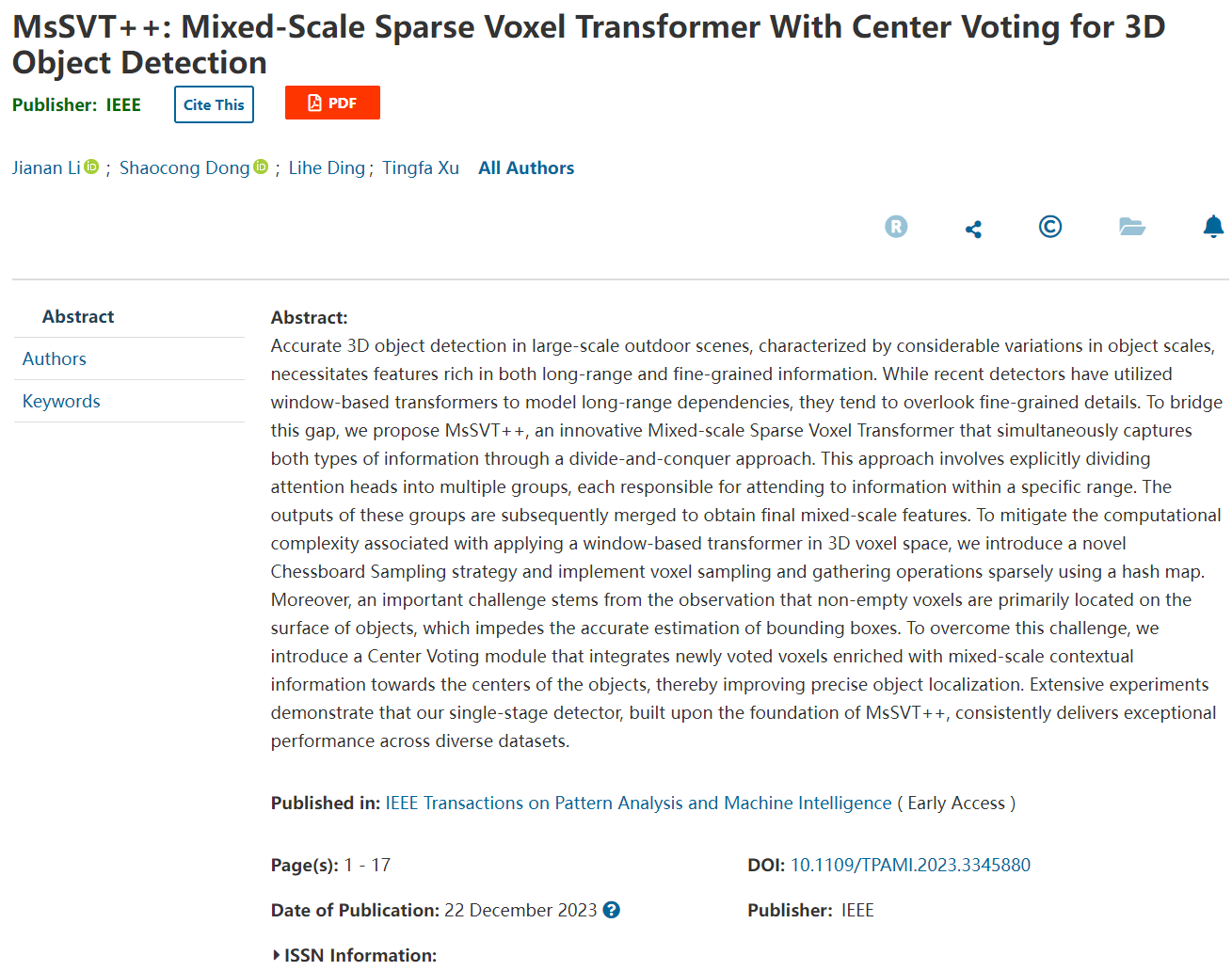 为了解决真实大规模场景下基于激光雷达点云数据的3D目标检测难题,街射 的许廷发教授科研团队开展了人工智能3D目标检测方法研究,取得了突破性进展。该研究成果以题为“MsSVT++: Mixed-scale Sparse Voxel Transformer with Center Voting for 3D Object Detection”的论文形式发表在国际顶级期刊《IEEE Transactions on Pattern Analysis and Machine Intelligence》上。IEEE TPAMI作为人工智能、模式识别和图像处理等领域的顶级权威期刊,其影响因子为23.6,是中国计算机协会(CCF)推荐的人工智能领域A类期刊。论文的第一作者为街射 李佳男副研究员,通讯作者为许廷发教授。