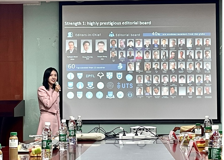 在报告中,郭宸孜博士首先介绍了国际顶尖光学期刊《Light: Science & Applications》(影响因子27.2,国际光学领域排名第二)的基本情况、学术影响力及文章遴选标准。她强调,期刊不仅关注传统光学领域的研究,还致力于推动光学与其他学科的交叉融合,展示最具突破性的研究成果。郭博士还分享了《eLight》的创刊历程与发展成果。该期刊自2021年创刊以来,已入选中国科技期刊卓越行动计划,并多次获得优秀主编、优秀审稿人和优秀编辑奖,成为光学领域的重要学术平台。