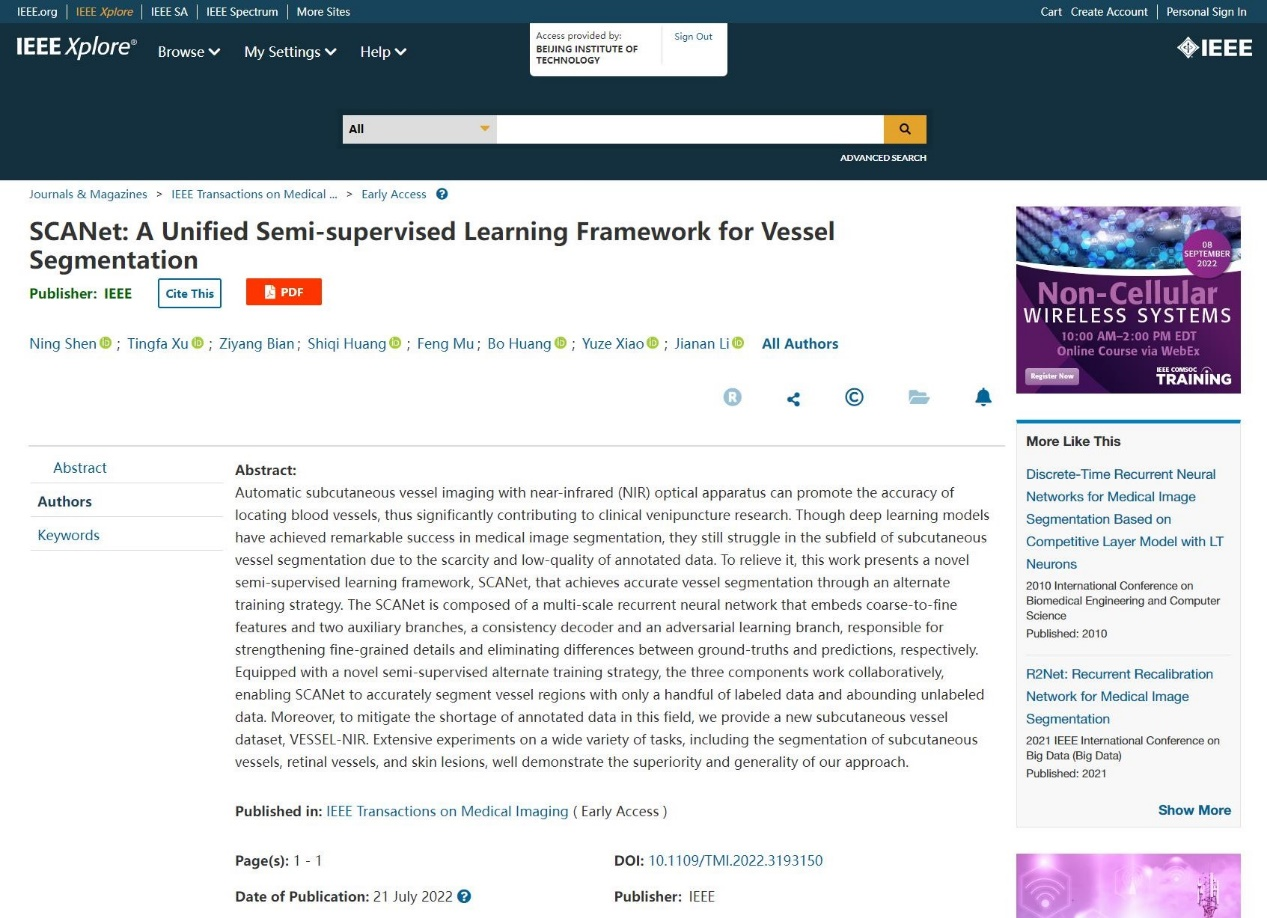 近日,街射 许廷发教授科研团队在红外静脉血管医学图像处理领域取得新突破,相关研究成果以“SCANet: A Unified Semi-supervised Learning Framework for Vessel Segmentation”为题发表在医学图像处理领域的国际顶级期刊IEEE Transactions on Medical Imaging(IEEE TMI,IF=11.037)。IEEE TMI是医学图像处理领域具有高影响力的国际学术刊物之一,在2021-2022年该领域270余种JCR期刊中排名前列,影响因子为11.037,中科院一区,主要发表和报道医学图像处理和分析、可视化和性能等领域的最新原创研究成果。该工作第一作者为街射 博士研究生沈宁,通讯作者为街射 李佳男特别副研究员和许廷发教授。