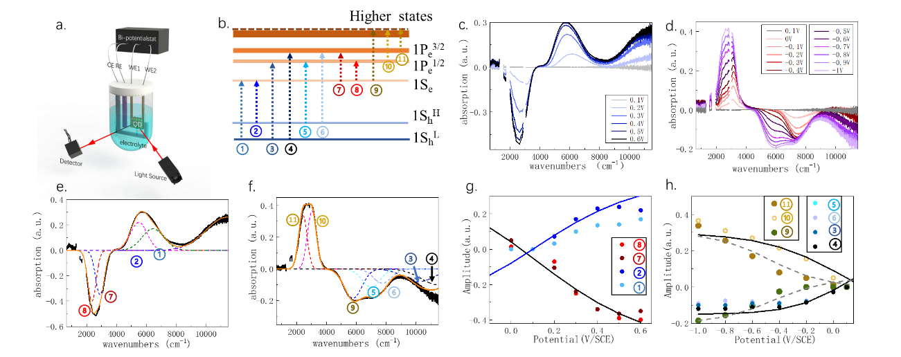 带内跃迁红外材料体系,对掺杂精确调控和载流子输运控制提出了更高的要求。该工作开发了带内跃迁胶体量子点混相配体交换方法(图1),可以有效减小量子点之间的间距,实现表面偶极子掺杂精确调控,并且使得材料在空气环境下稳定。并且搭建了光谱电化学平台(图2),获得精确的HgSe胶体量子点能带结构,证明材料中无明显缺陷态。