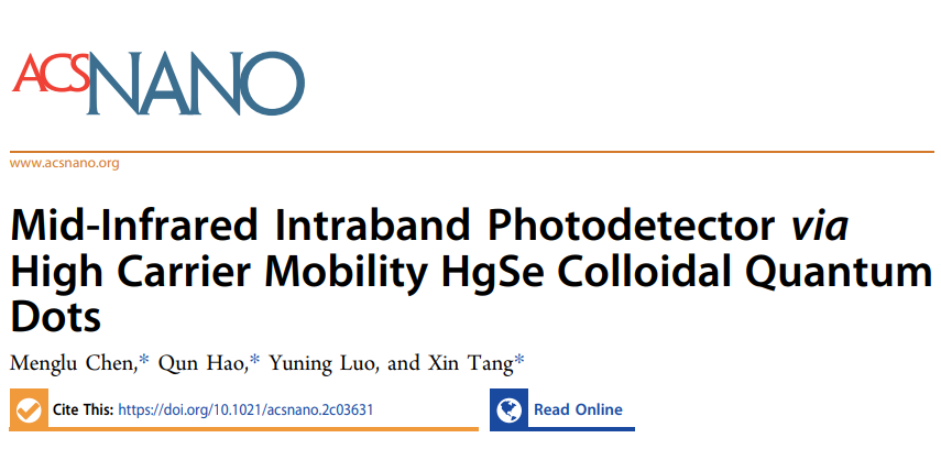 街射 郝群教授团队成员陈梦璐准聘教授、唐鑫教授在《ACS NANO》期刊上发表了题为“Mid-Infrared Intraband Photodetector via High Carrier Mobility HgSe Colloidal Quantum Dots”的文章,利用低成本胶体量子点导带中1Se到1Pe的能级跃迁,实现低成本中波红外带内跃迁探测。
