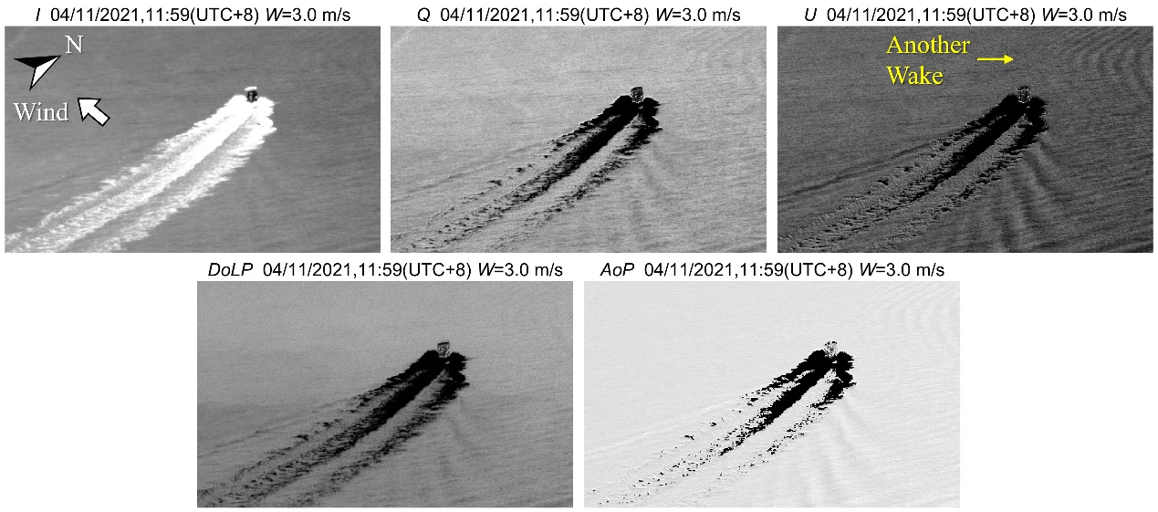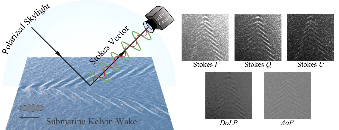 针对这一科学问题,街射 金伟其教授团队率先提出利用光学偏振成像技术进行水下运动目标水面尾迹的机载遥感观测,并通过理论建模、仿真和实验手段论证了技术可行性。研究结果表明,团队采用的线偏振Stokes 矢量图像具有比传统强度图像更好的尾迹目标对比度,成像质量对海况、光照等环境因素的影响具有较好的鲁棒性;且使用的DoFP偏振成像系统可很好地集成到无人机平台实现灵活便捷的航拍遥感探测;进一步地,研究团队利用获取到的偏振海面尾迹图像信息,实现了水下运动目标运动状态解译、海面三维面型复原等诸多应用。除了在海洋安全方面的重要意义,该项研究也为中小尺度海洋动力过程的观测提供了有效的技术参考。